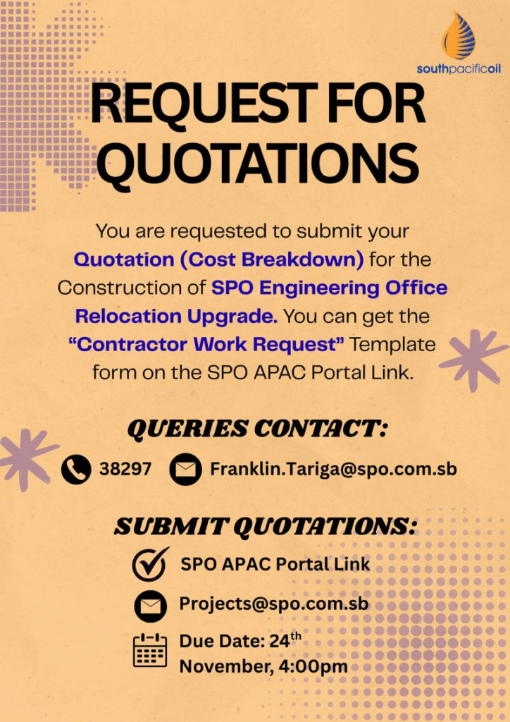 South Pacific Oil Ltd invites sealed or digital submissions from qualified and experienced contractors to submit Quotations (Cost Breakdown) for the construction of the SPO Engineering Office Relocation Upgrade. You can get the โContractor Work Requestโ Template form on the SPO APAC Portal Link.